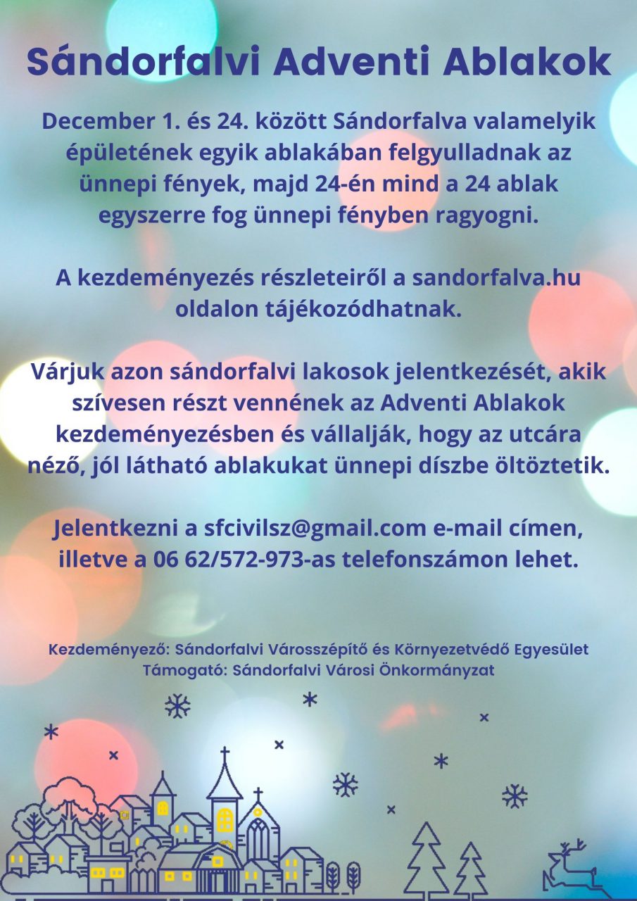 Sándorfalván is elindítják az Adventi Ablakok kezdeményezést, amellyel terveik szerint ünnepi díszbe öltözhet a város. A közösségi kezdeményezés kapcsán december 1. és 24. között minden nap ünnepi fények gyúlnak valamelyik sándorfalvi ház ablakában.