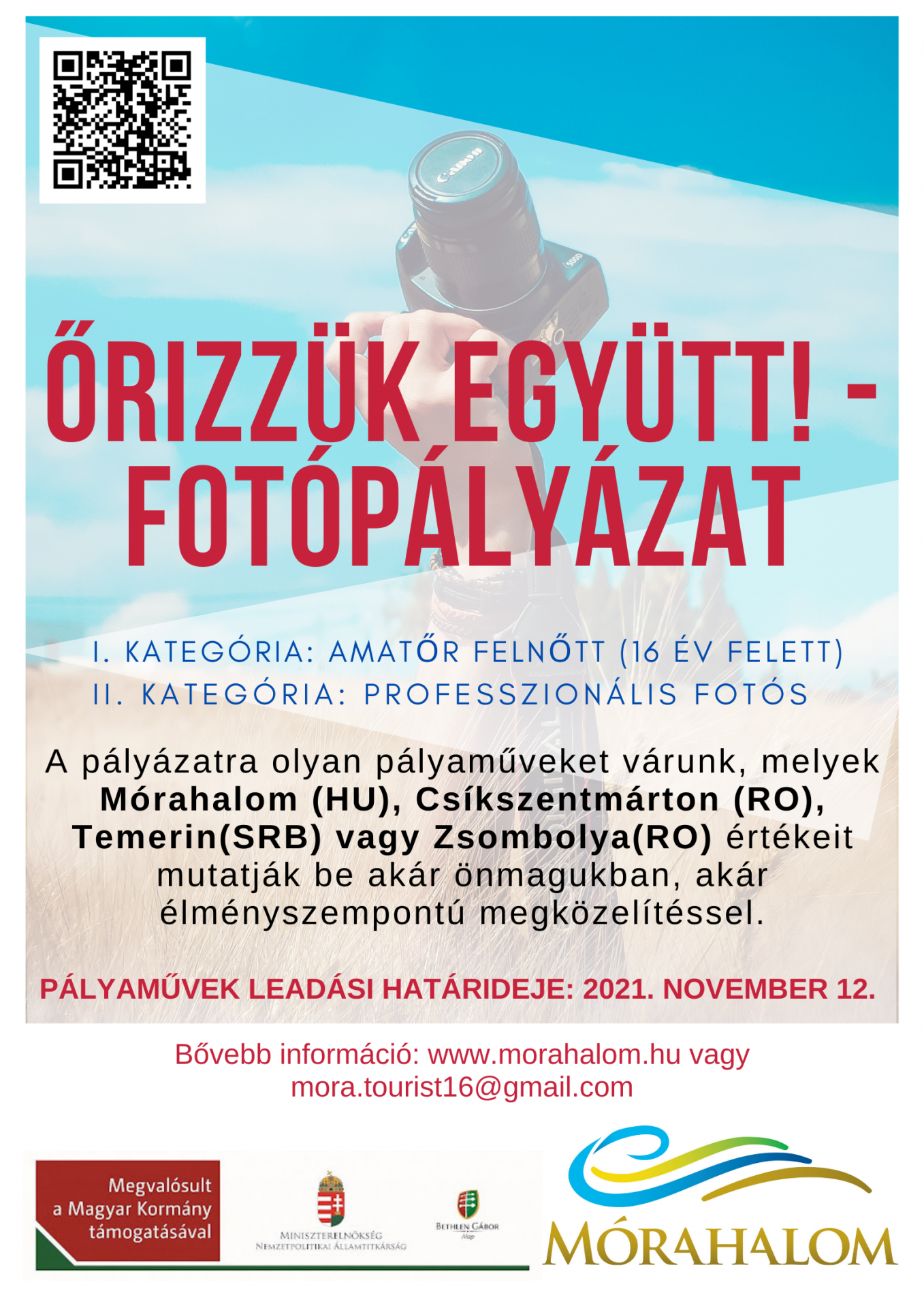 A fotópályázatra amatőr felnőtt (16 éves kortól) és a professzionális fotós kategóriában lehet nevezni. A képek lehetnek életképek, épületek, természeti környezet, minden ami bepillantást enged az adott település ott élő lakosainak életébe, értékeibe. A pályaműveket november 12-ig (péntek) lehet elküldeni a mora.tourist16@gmail.com e-mail címre. Egy pályázó maximum 3 db fotóval pályázhat, melyet .jpg formátumban kell elküldeni. Mindkét kategória első 3 helyezettje részesül nyereményben. A beküldött képeket decembertől bárki megnézheti, ugyanis a mórahalmi Szent László parkban kiállítást szerveznek belőlük. Részletes információ a https://www.morahalom.hu/hu/reszletek/orizzuk-egyutt-fotopalyazat oldalon található.